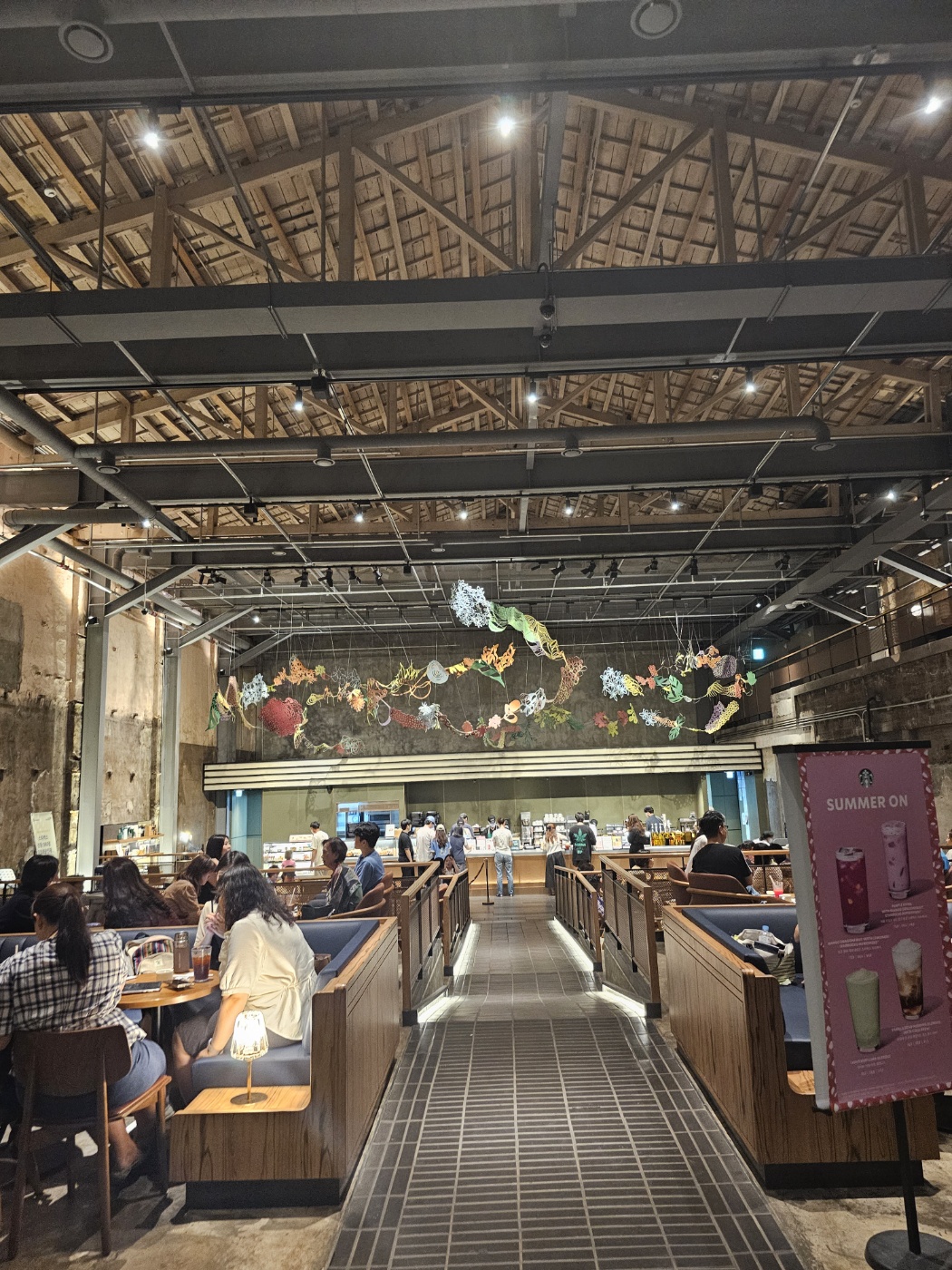 사진에서 보시다시피 개성고침코너 옆에 스타벅스 입구가 있습니다. 들어가시면 스타벅스가 있고 음료도 스폐셜 음료로 쑥라떼와 블렌디드가 있어서 하나씩 시켜서 먹었습니다. 4시쯤인가 갑자기 밴드 두분이 오셔서 공연도 해주시더라고요 (매우 신기했습니다.)