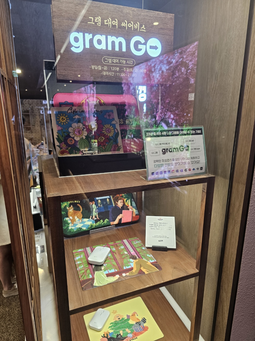 * 개성고침 코너 - 설문을 통한 스타일의 스티커 굿즈를 줍니다. 노트북 대여 서비스도 있어 그램 노트북을 빌려 사용하고 스타벅스 쿠폰도 받을 수 있습니다. 저는 그램 360도를 사용해보고 싶어서 대여 받아 스타벅스에서 사용하고 야구 경기도 봤네요 ㅎㅎ.
