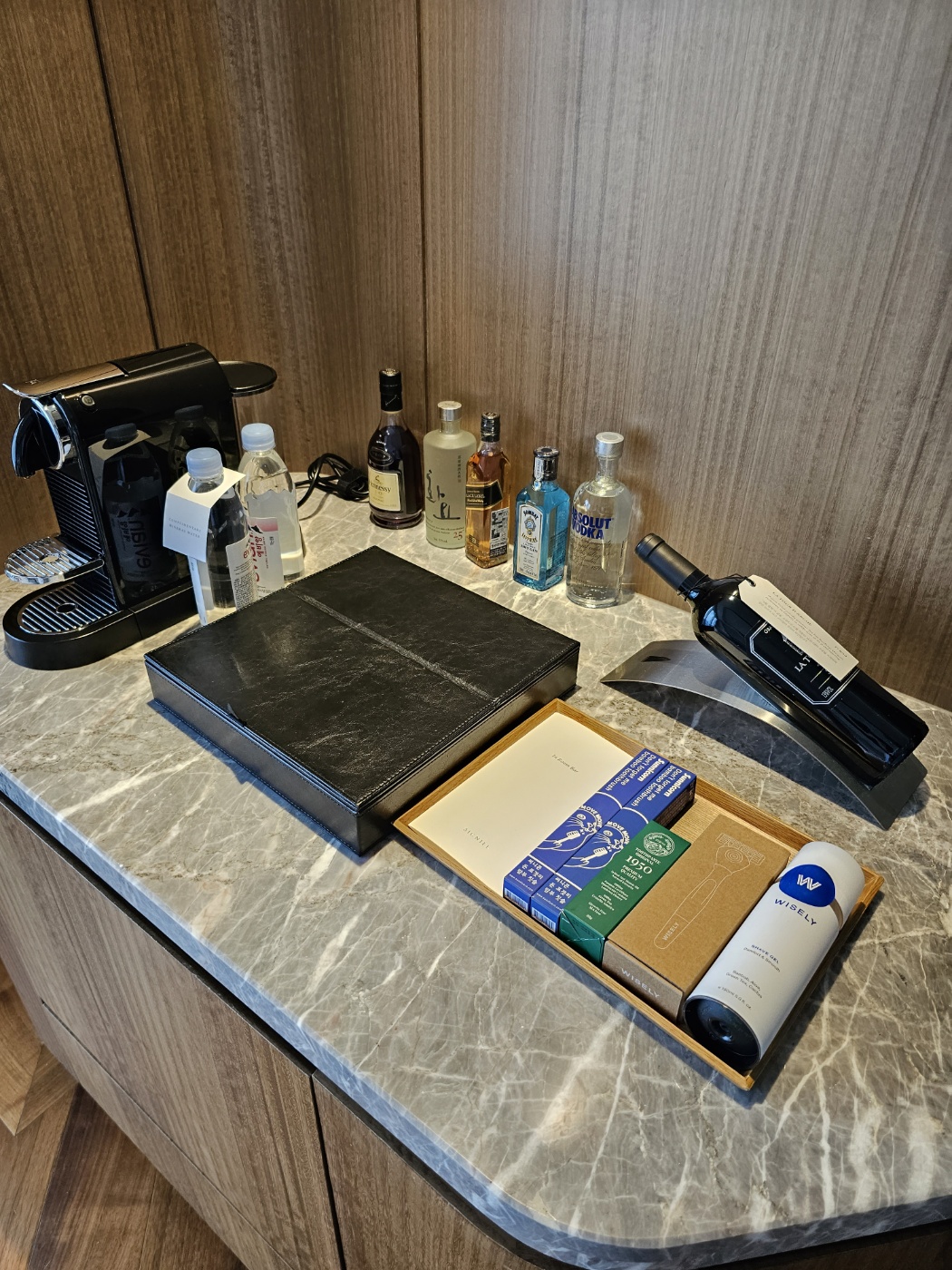 룸에서 커피머신이 있고 캡슐 6개를 제공해줍니다. (3종류 2개씩), 차 티백도 존재하고 나머지는 유료입니다.
