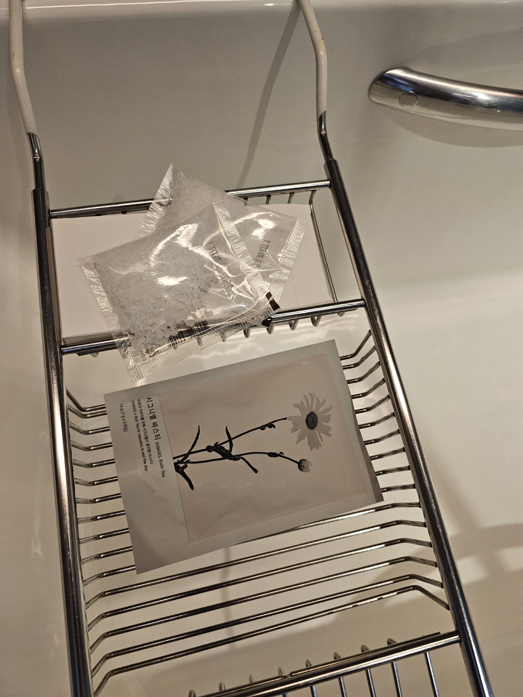 아 그리고 아래 사진처럼 욕조에 기본적으로 호텔에서 솔트 밤과 티백(?)느낌의 욕조에 넣어 향을 나게 해주는 밤을 제공해줍니다.