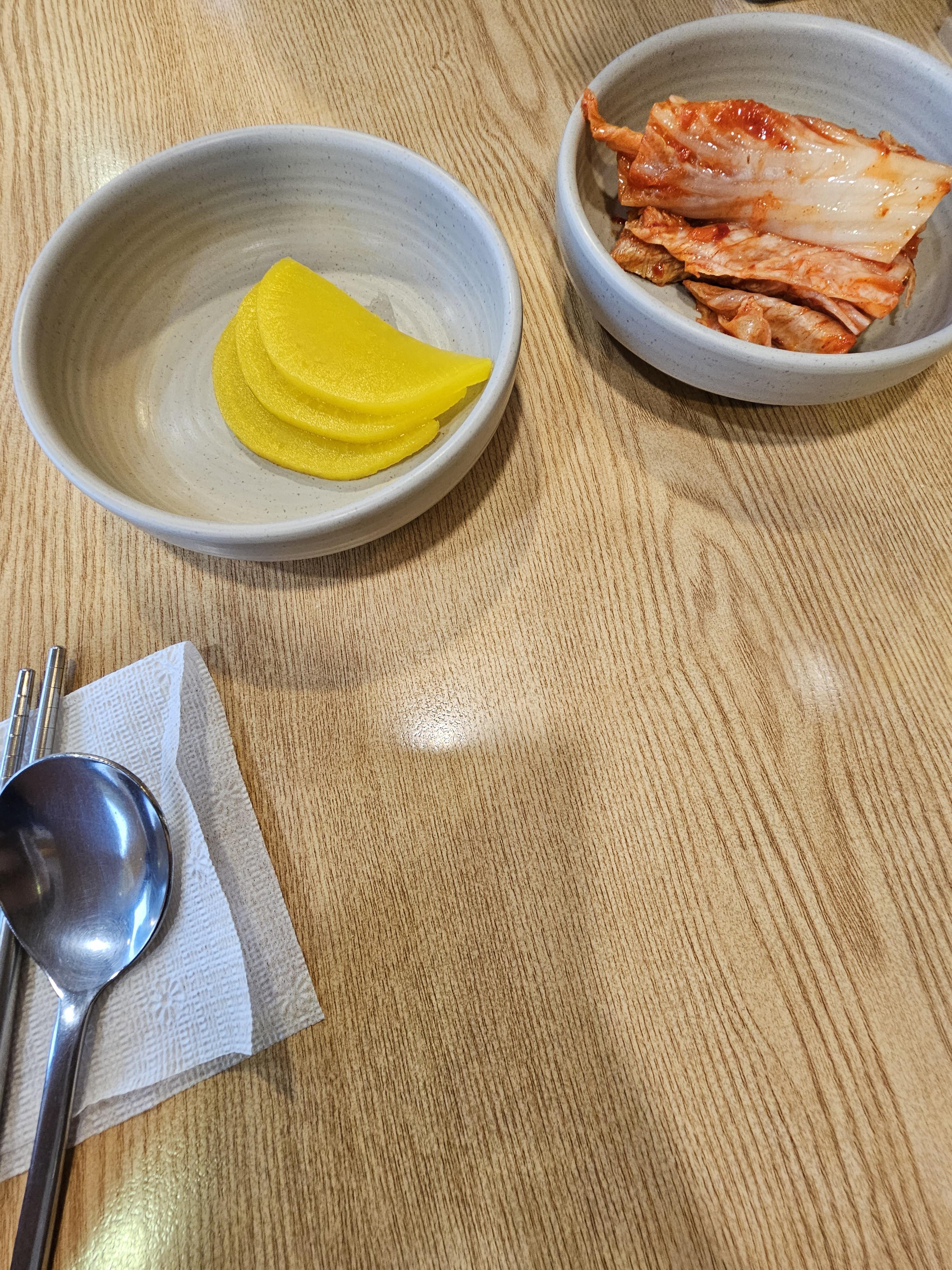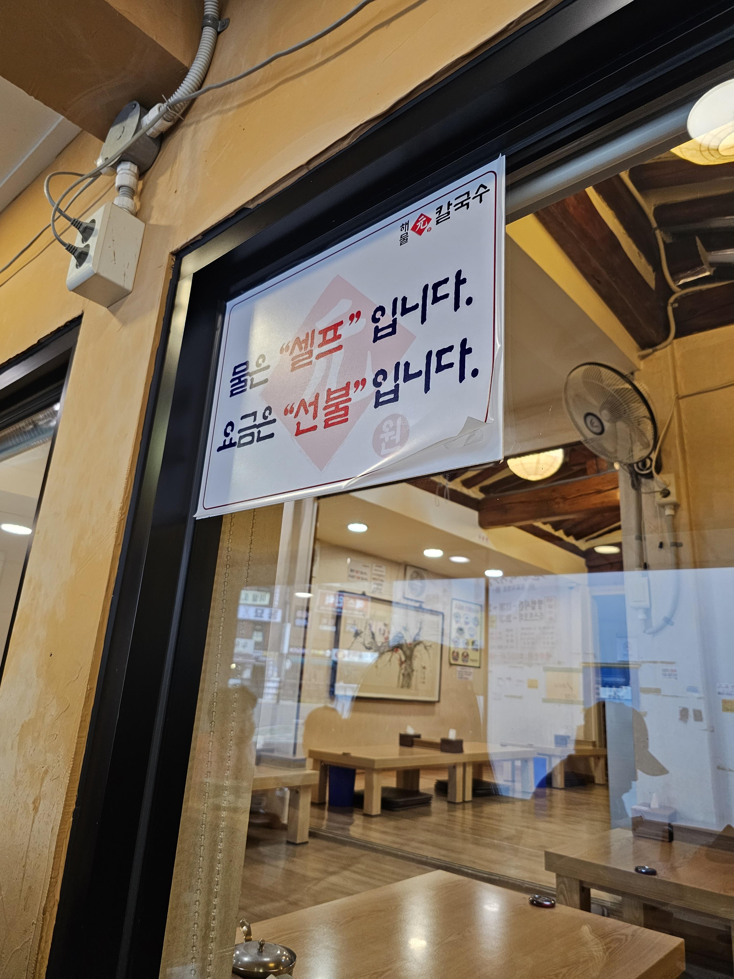 메뉴를 시키면서 결제를 먼저하는 형식입니다. 만두를 먹을까 고민하다 간식을 거하게 먹은터라 소불고기 칼국수와 황태비빔냉면을 시켰습니다.김치와 단무지를 갔다주시고 물은 셀프입니다. 테이블 근처에 바로 정수기가 위치하고 있었습니다.