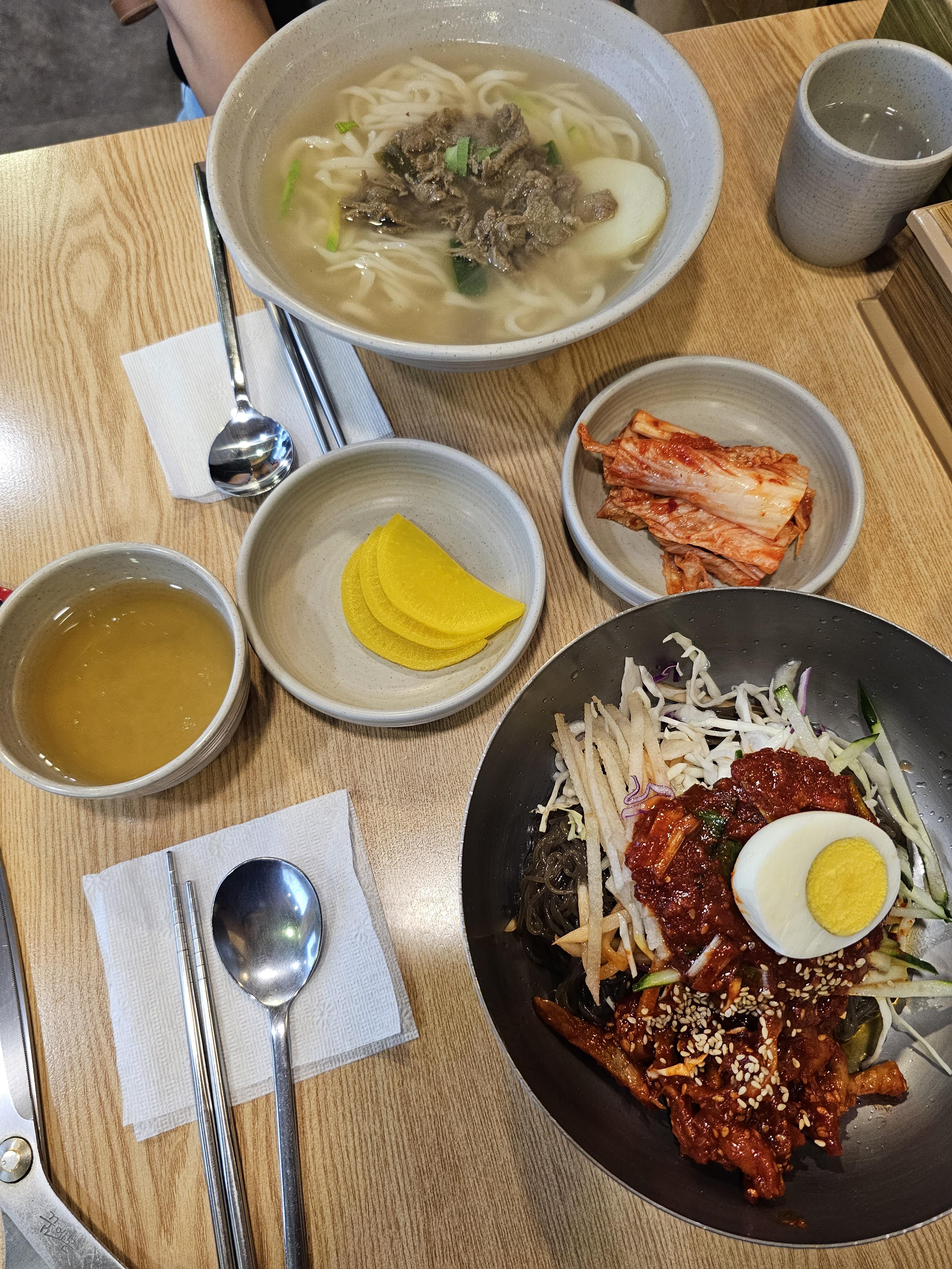 저는 사골을 좋아해서 칼국수가 더 맛있었네요. 칼국수 면 한입, 그리고 국물 한입을 같이 먹으면 환상의 조합이었습니다. 비빔냉면도 푸짐하고 맛있어서 황태 올려서 냉면 한입 먹으면 끝내줬습니다.